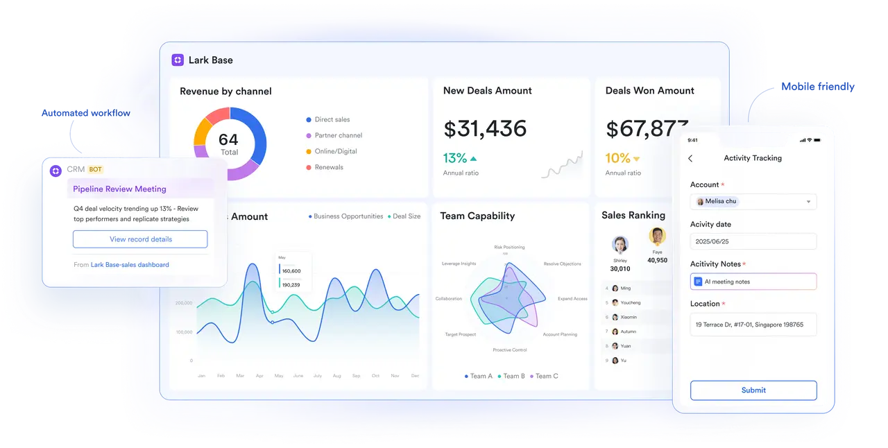 In agile organizations, data isn't a reference—it's a live participant in every decision. Lark Base gives teams the space to organize and act on their information as it changes, transforming static records into living workflows. This flexibility is especially useful for teams already using CRM software and needing a system that can adapt to broader operational processes.