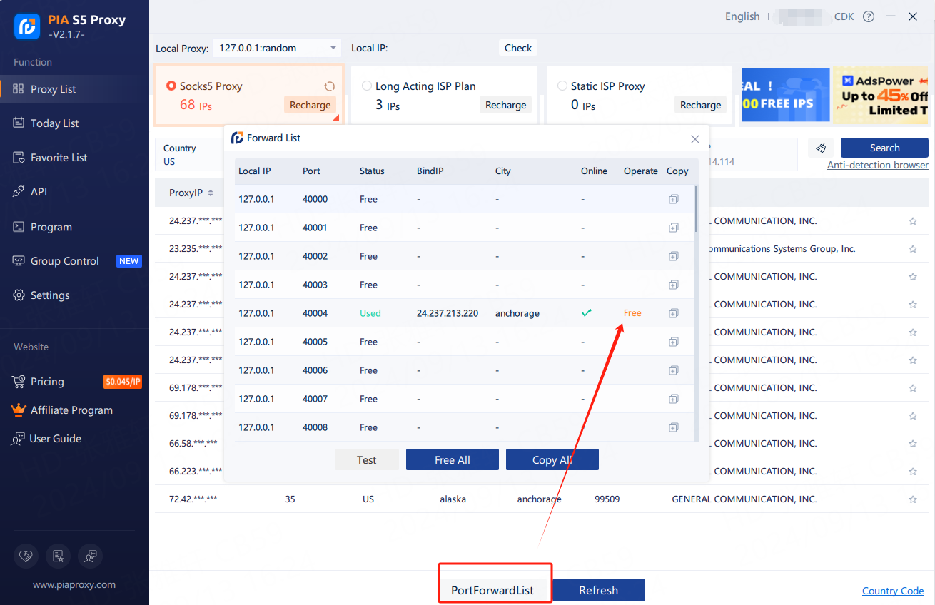 1.1.4 Click the port forwarding list to view the extracted IP information, click the plus sign to copy