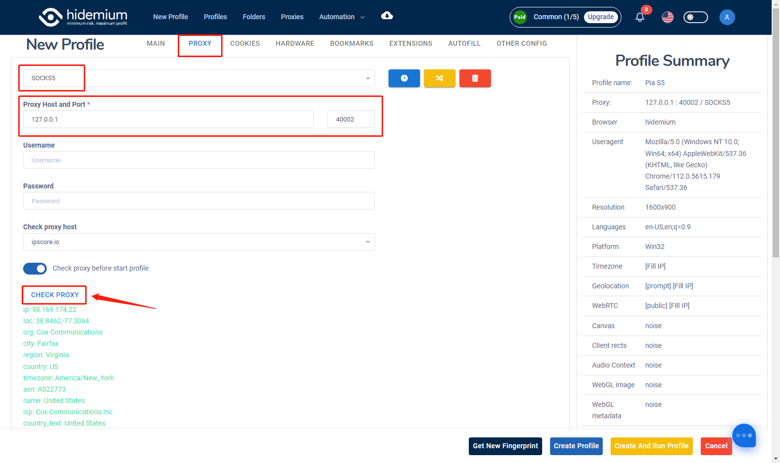 2.1.2 Click "Proxy" above, select the proxy type as socks5, then paste the proxy IP and port just copied, and finally click Check Proxy IP