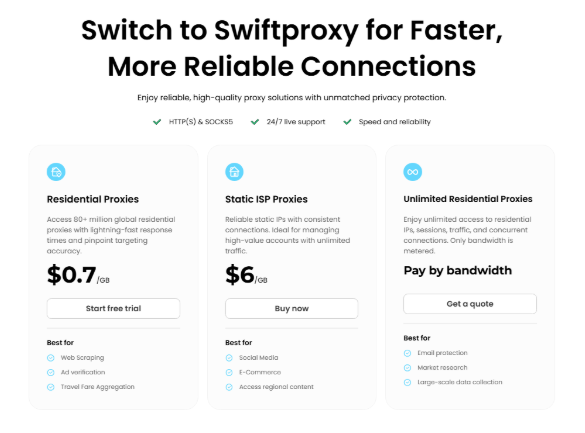 Swiftproxy combines high-quality proxy performance with competitive pricing, ensuring that both individual users and businesses can find a plan that fits their needs.