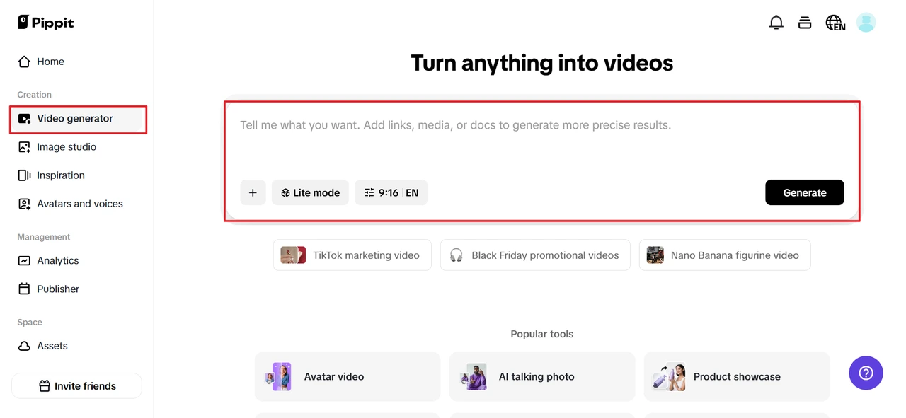 This is precisely why Pippit feels like a small miracle: for the first time, creators can create expressive, polished on-camera videos without showing their real faces or recording a single line of audio. And the magic begins with tools like an AI video generator free feature that lets beginners skip the awkward takes and jump right into a confident performance.