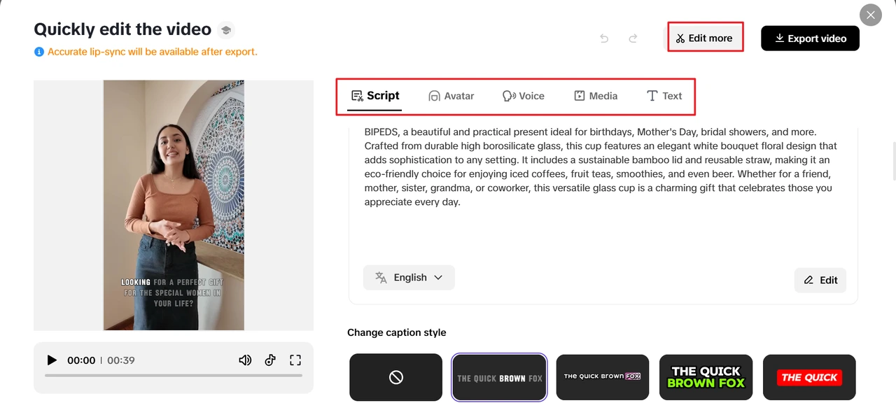Now, with your intro generated, select the clip and open Quick edit. You'll want to adjust your caption styles, tweak the script, change your voiceover character, and then pick an avatar that fits your branded personality. If you want deeper control, click the Edit more button to open the full editor. Here, you can combine the intro with your main video, tweak transitions, and lock the aspect ratio to 16:9-the perfect fit for YouTube.