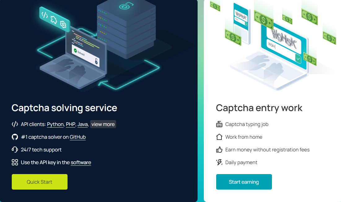 - Интеграция и функции: Имеет простой API (HTTP и JSON) и совместим с общими протоколами других сервисов. Предоставляет готовые плагины для браузеров (Chrome, Firefox) и поддерживает SDK для разных языков программирования. Также 2Captcha позволяет самим пользователям заработать, разгадывая капчи других (биржа труда).