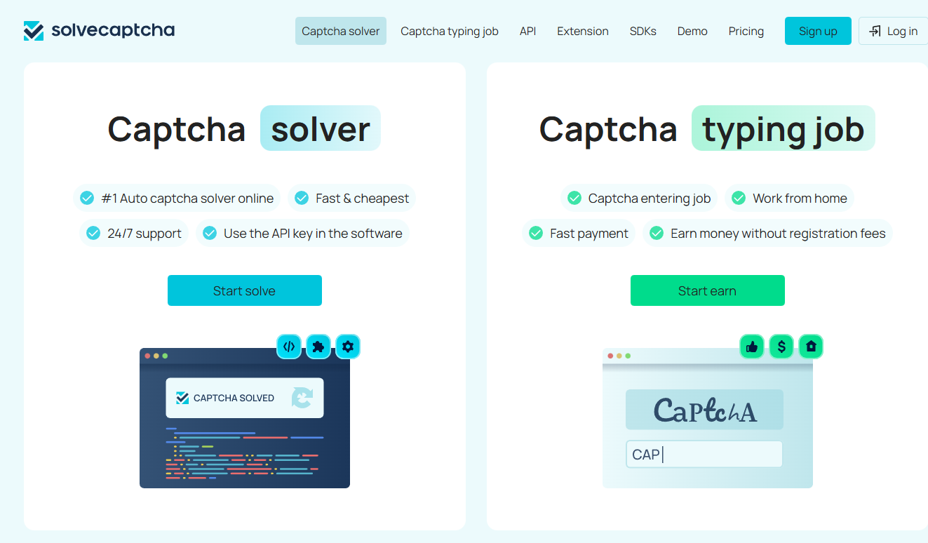 | SolveCaptcha | Гибрид (ИИ + люди) | ~$0.5 (простые); ~$0.55 ReCAP v2 | 5-15 сек (простые ~5с; ReCAP ~13с) | 95-99% | Совместимость с API 2Captcha; быстрое решение популярных капч |