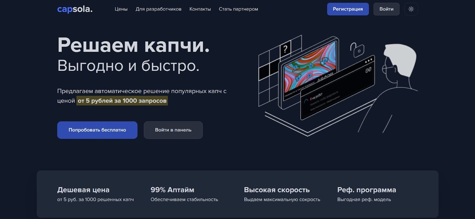 | CapSola | ИИ (ML) + спец. под капчи Рунета | 1-5 руб за 1000 (≈$0.01-0.05) | 5-7 сек | 90-95% | Оптимизировано под Яндекс и локальные капчи; фиксированные низкие цены; 99% аптайм |