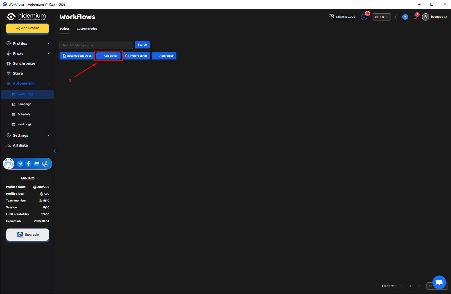 Hidemium – một trong những trình duyệt antidetect browser hàng đầu hiện nay – đã tích hợp tính năng Automation + AI Prompt Script. Dưới đây là cách bạn có thể bắt đầu: