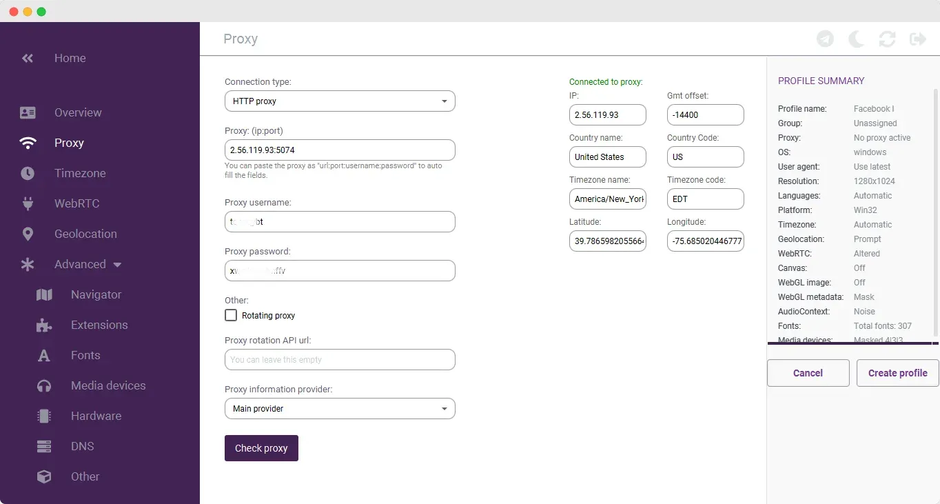 即使您更改了 IP,您的常规浏览器仍然可以通过浏览器指纹识别来检测到。 Incogniton 通过创建 独立的虚拟配置文件,每个配置文件都会有一个唯一的指纹。此外,您还可以集成 代理人 每个配置文件根据每个国家或地区更改 IP 地址,从而提高可靠性和匿名性。